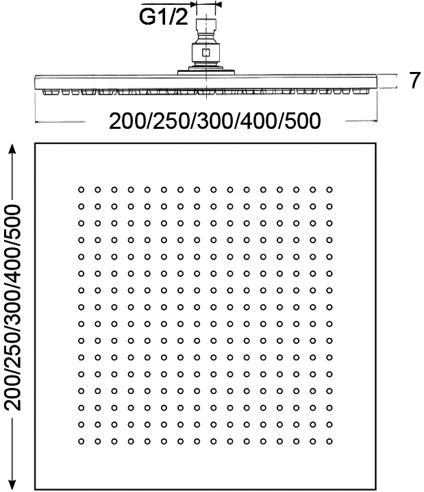I prodhuar nga material brass (ottone), rezistent dhe jetëgjatë. Me përmasa 50 × 50 cm dhe lidhje standarde 1/2” M × 1/2” F. I pajisur me nyje rrotulluese, veshje antikalkare dhe i çmontueshëm për pastrim dhe mirëmbajtje.