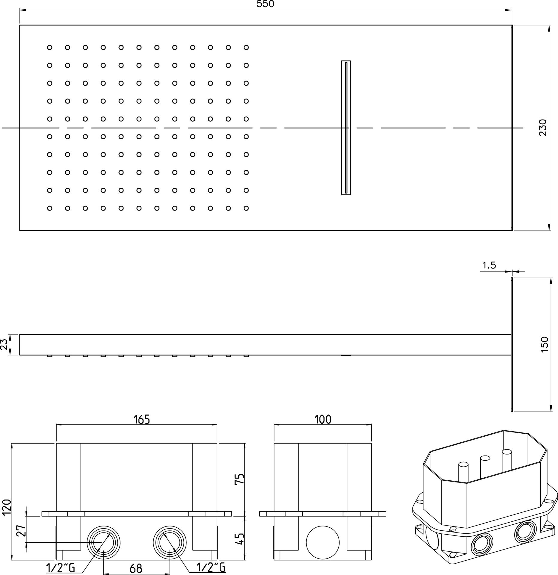 I prodhuar nga material brass, rezistent dhe jetëgjatë. Me përmasa 55 × 23 cm dhe montim në mur (a parete). Ofron rrjedhje shi (pioggia) dhe ujëvarë (cascata) për një përvojë dushi relaksuese. Pjes