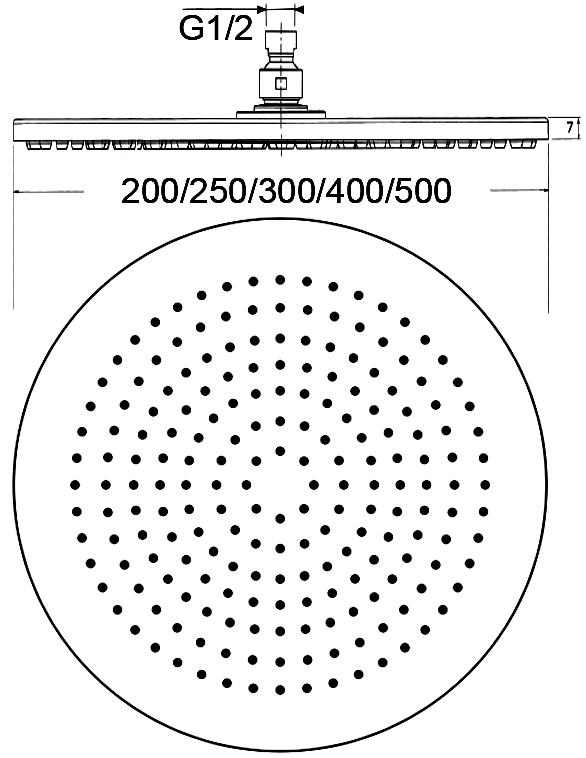 I prodhuar nga material brass (ottone), rezistent dhe jetëgjatë. Me diametër 50 cm dhe lidhje standarde 1/2” M × 1/2” F. I pajisur me nyje rrotulluese, veshje antikalkare dhe i çmontueshëm për pastrim dhe mirëmbajtje.