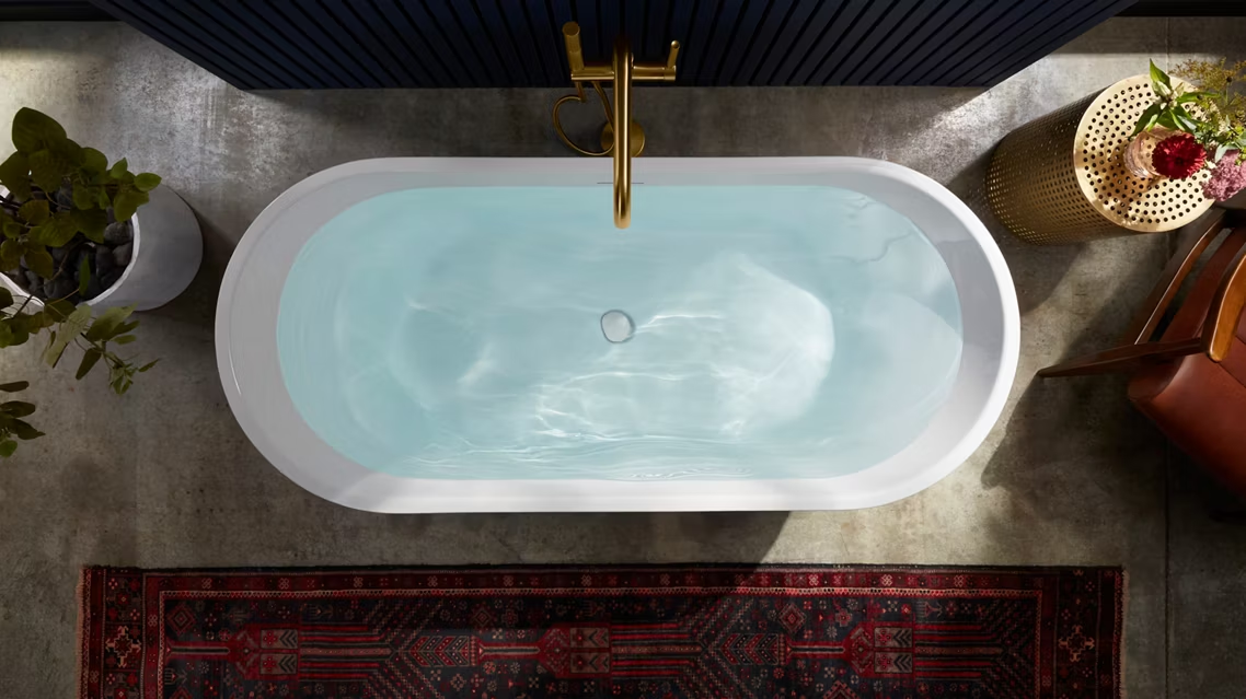 Sleek and minimalist, the rounded ends of the oval Evok® bath offer a soft, warm presence that easily makes itself at home in traditional and transitional environments as well as modern ones.
