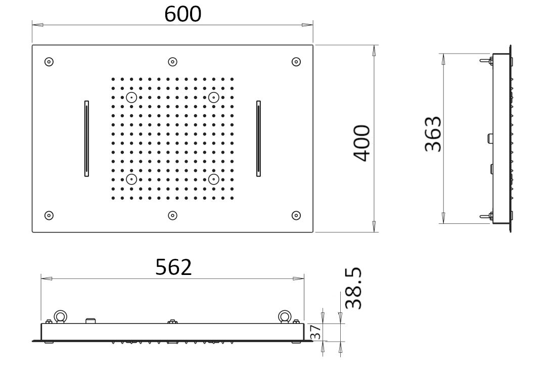 I prodhuar nga material inox (acciaio), rezistent dhe i qëndrueshëm. Me përmasa 60 × 40 cm dhe montim në tavan (a soffitto). Me veshje antikalkare dhe funksione rrjedhjeje shi (pioggia), ujëvarë (cascata) dhe spërkatje të imët (nebulizzato) për një përvojë dushi relaksuese.